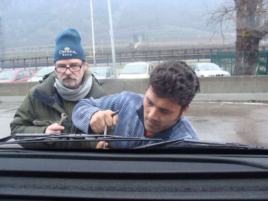 Det regnar som sjutton i Italien och runt Bologna gängar vindrutetorkarnas armar upp sig. Två av tre rör sig inte ur fläcken. Som tur är funkar den framför föraren.
