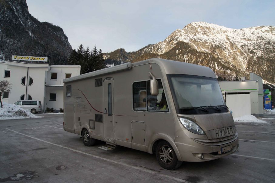Efter en ansträngande kvällskörning på serpentinvägarna i Tirol hittar vi en bussparkering bland alptopparna.