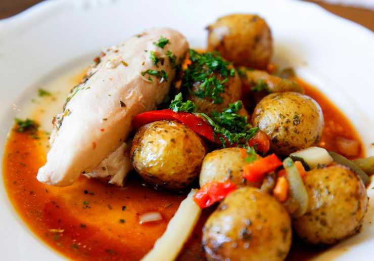 Dagens lunch, kyckling med stekt potatis och skysås.