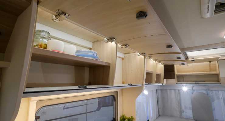Ovanpå dessa finns en djup och praktisk avsats och ovanför den ett par hyllor som döljs av en lodrätgående jalusidörr. Här finns även ett utdragbart tv-fäste. Under kyl och frys hittar vi en lucka som erbjuder ytterligare förvaring. I köket finns både taklucka och fönster, liksom uttag för 230 volt. Köksfläkt saknas.