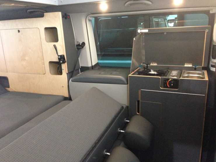 I övrigt vad gäller SpaceCamper ska vi även nämna att det i Sverige nästan okända företaget bygger modulinredningar till Volkswagen T5. Dessa kan tas ur när man inte vill använda bilen som husbil. Till 2014 lanseras en modul till femdörrars VW T5 med vridbart kök så att man kan stå utomhus och laga mat tack vare den femte dörren på vänster sida. Öppna skjutdörren på sidan - sväng ut köket och bänkskivorna och du kan förutom att njuta av en ergonomisk höjd även ha ett stort utomhuskök med två spisar och hoar. Vanligt i husbilar i den här storleken är att köket hamnar alldeles för lågt eller att man måste sitta på sidan om i en stol vid matlagningen.