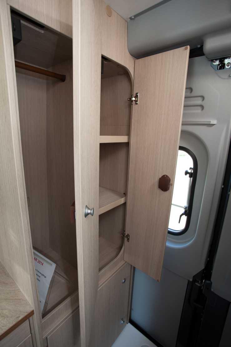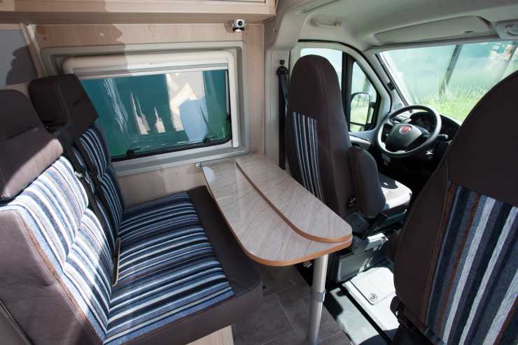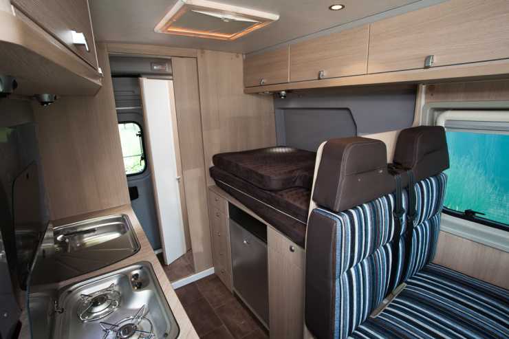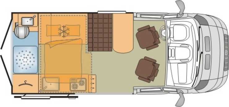 Planlösningen är lite egen. Det finns ingen fast bädd utan en dubbelsäng bäddas upp över köket, man sover alltså på tvären mitt i bilen. Sängen är 123 till 135 cm bred och 195 cm lång. En stor nackdel med denna lösning är naturligtvis att det är ganska omständigt att koka en kopp te på kvällskvisten om sängen är bäddad. Sängen måste tas bort för att köket och kylskåp ska kunna användas.