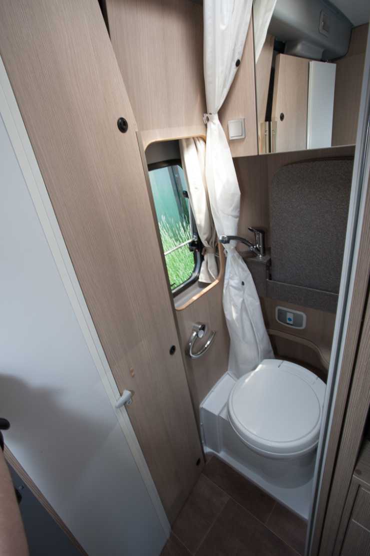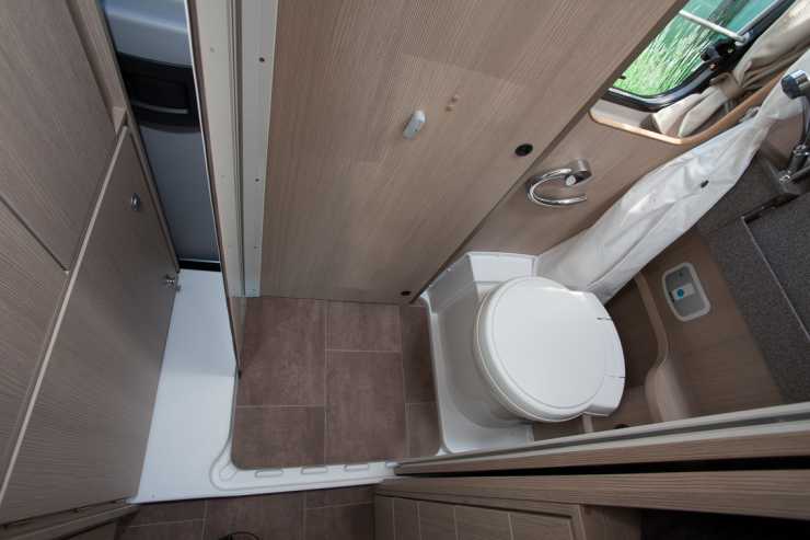 Längst bak i bilen finns ett utrymme som kan fylla flera funktioner. I ena hörnet finns en toalett som kan byggas ut till en dusch. I andra bakre hörnet finns två garderober.