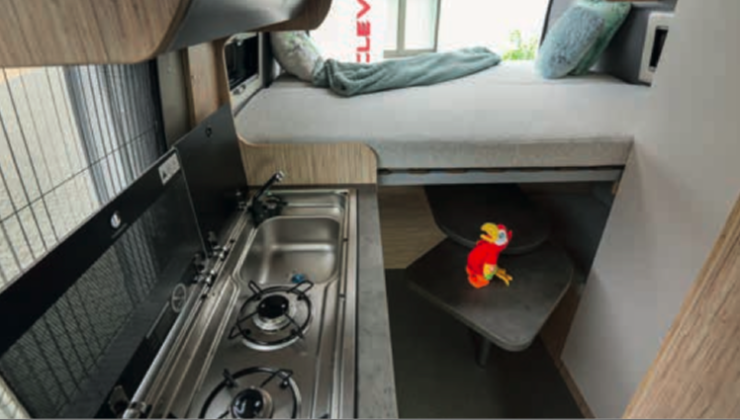När man kommer in hittar man badrummet tvärsöver och till vänster finns köket. Badrummet har en Thetfordtoalett och det hörnhängda handfatet har en utdragbar kran som även tjänar som dusch, har man valt till badrumsfönster kan man tack vare lång slang dra ut kranen och duscha utomhus. För att stänga om sig finns en skjutbar lamelldörr men vill man ha fönster i badrummet blir det som tillval. Kompressorylskåpet på 70 liter med ett litet frysfack har den dubbelhängda dörren i färdriktningen och är placerat direkt till vänster vid entrédörren och det blir då lätt att nå innehållet både från in- respektive utsidan. Den tvålågiga spisen och hon döljs under glaslock men några större avställningsytor finns det inte plats för. Under spisen finns kylskåpet och under hon en låda och längst ner ett skåp med plats för gasolflaskan. Överskåpet är rymligt men saknar dock hyllor och färskvattentanken rymmer 60 liter, gråvattentanken 50.