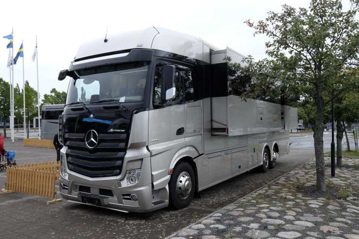 Morgan hymlar inte med att han är perfektionist. Utvändigt är husbilen skinande blank och innanför dörrarna är känslan att man kommer in i en husbil som precis har lämnat fabriken. Men så är det inte. Morgans 12 meter långa och fyra meter höga Golden Dream, byggd på ett 3-axlat Volvo FH12-chassi, levererades 2016. Bilen har tagit familjen runt på resor både i Sverige och Europa. Bilen som visades på Elmia är dock som synes byggd på Mercedes chassi.
