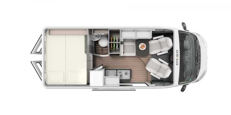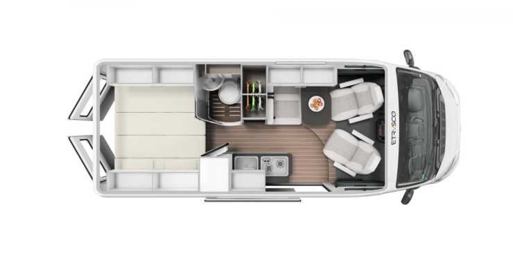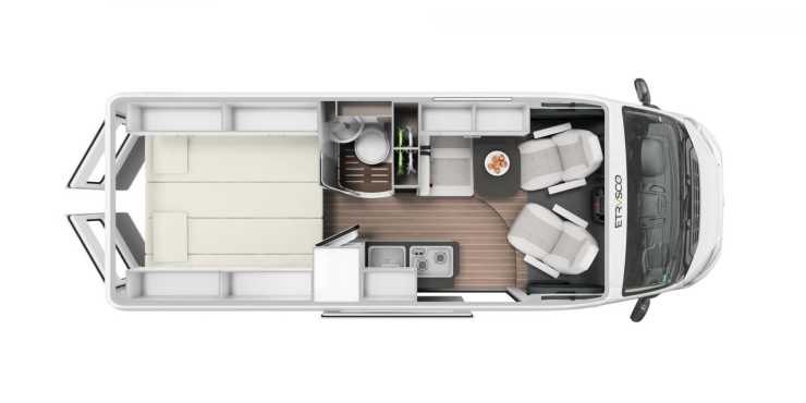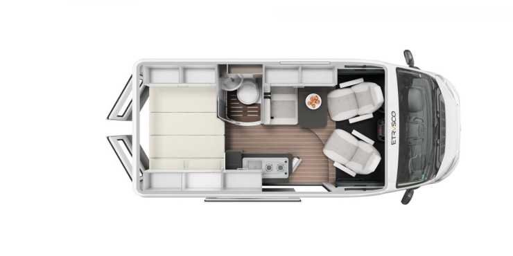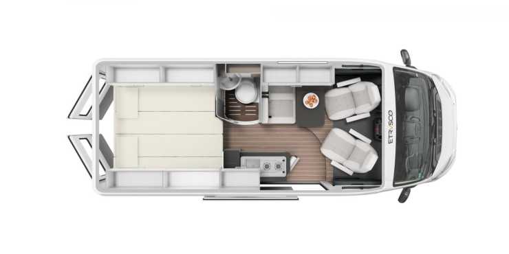 Etrusco valde att premiärvisa den nya Vanolo-serien på mässan CMT i Stuttgart 2020. Segmentet har vunnit terräng på kontinenten under senare år och är något helt nytt från Etrusco. Med kompakta yttermått vänder den sig till kunder som ofta beskrivs ha en aktiv livsstil och den öppna planlösningen får sägas vara modern och rymlig, om än inte spatiös. Det valfria pop up taket används till två extra sovplatser.