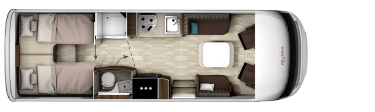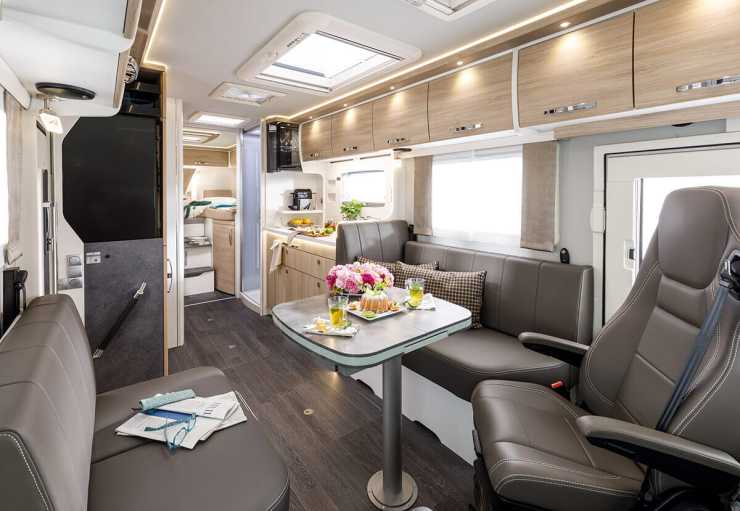 Inredningen bjuder på en stor U-formad sittgrupp med två motstående soffor i kombination med framstolarna. Köket är längsgående och ståhöjden är väl tilltagen med 203 centimeter. De längsgående sängarna är 195 respektive 200 centimeter och dessutom finns en elektriskt manövrerad taksäng. Dusch och toalett är separata och toadörren kan skärma av sovrummet och det finns även en skjutdörr direkt vid sängarna vilket gör att man kan välja att ha tillgång till toaletten utan att störa den som sover.