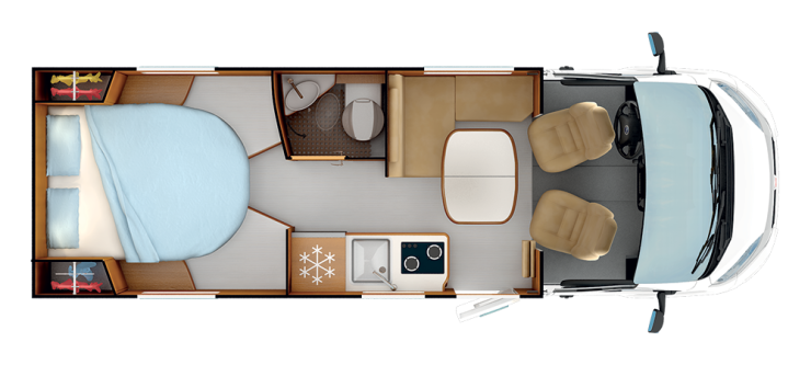 Planlösningen följer gängse standard med badrum och kök i mitten, köket på passagerarsidan. Det som skiljer ut den är att den elektriskt (tillval) höj och sänkbara dubbelsängen centrerats och kan fällas upp vid fotändan för att ge åtkomst till skåpen.