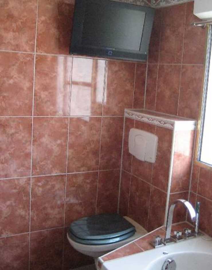 Vägghängd tv och toa i badrummet och gedigna blandare till dusch och badkar.