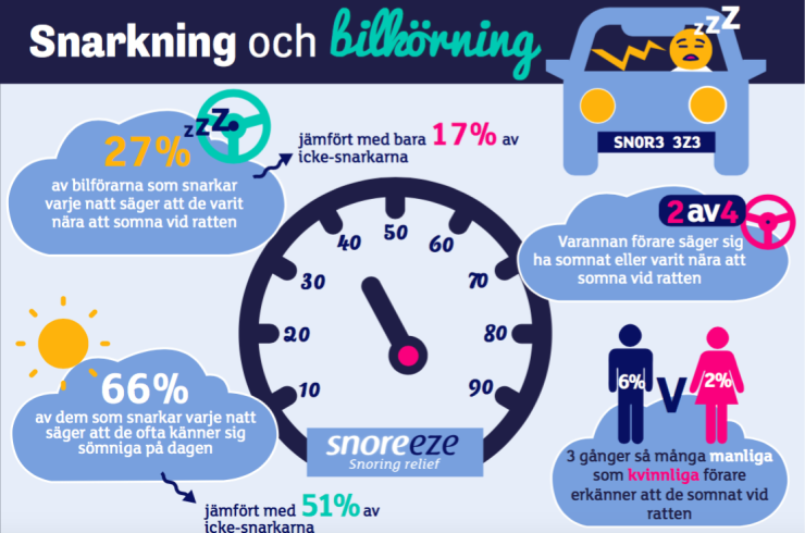 En undersökning* från Snoreeze, en stor tillverkare av snarkningslindrande produkter, visar att förare som snarkar varje natt löper tre gånger större risk att somna framför ratten jämfört med förare som aldrig snarkar (9% jämfört med 3%).