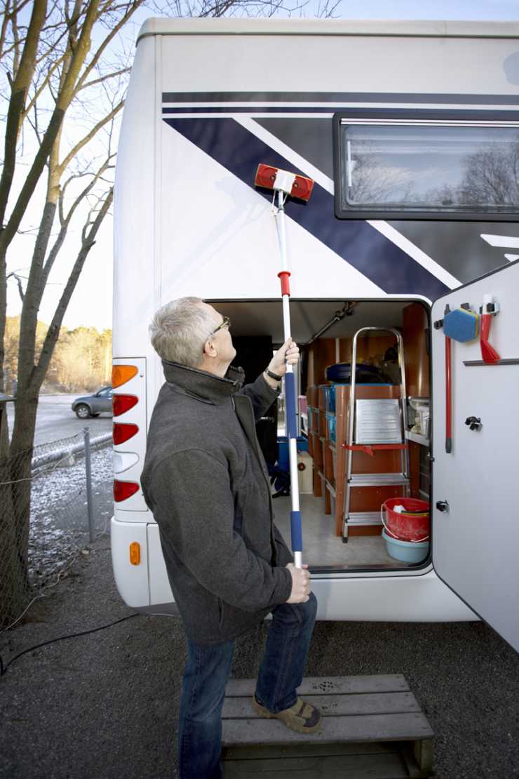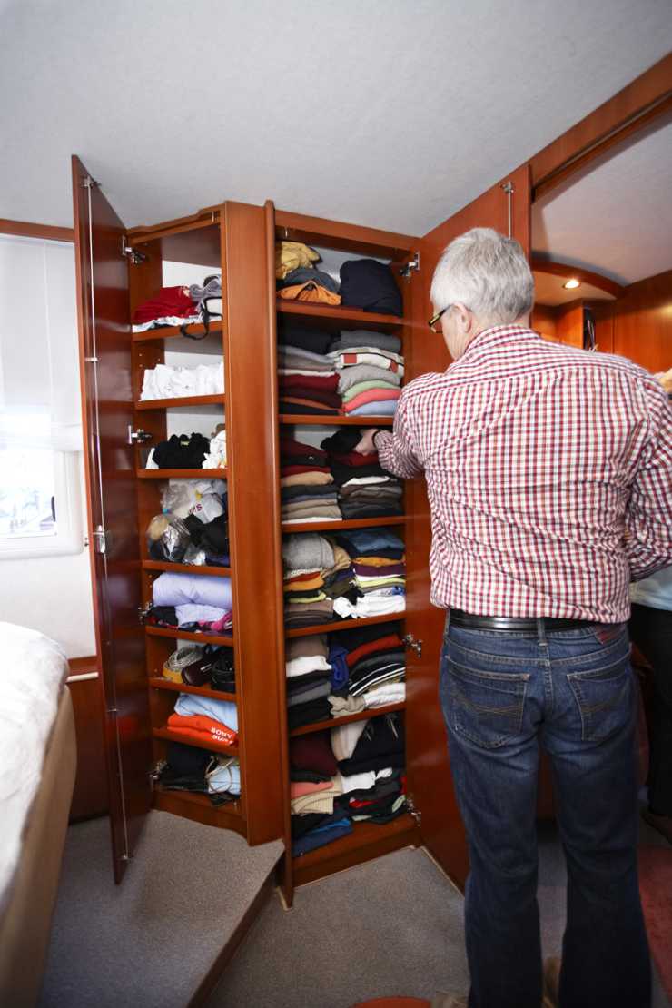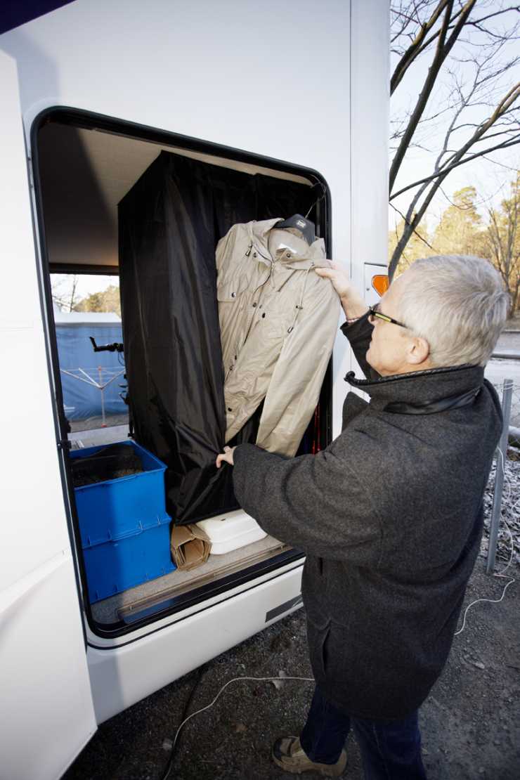 Hon öppnar klädskåpen i sovrummet. Där förvaras kläder i prydliga högar. I lastutrymmet har de inrett med smarta lösningar där allt mellan himmel och jord förvaras. På campingtomten står ett litet tält som bland annat rymmer utemöblerna under vintern. Det är välordnat och verkar funktionellt.