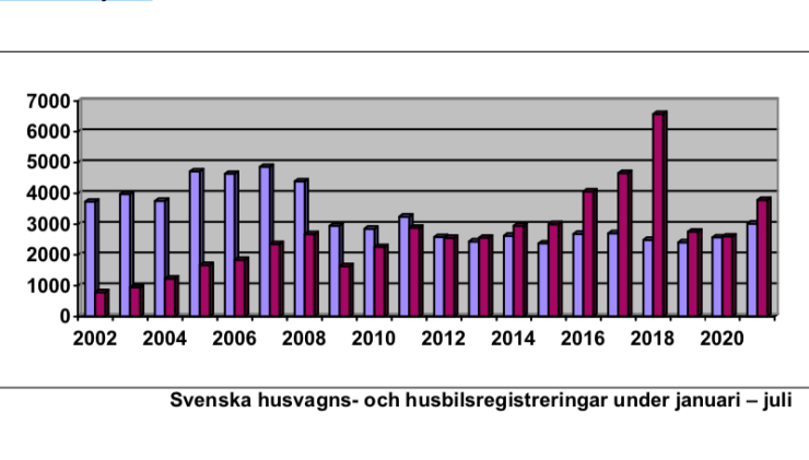 Juli månads husbilsregistreringar visar enligt HRF 662 stycken, medan det i juli föregående år registrerades 617 husbilar. Hittills under kalenderåret 2021 har det totalt registrerats 3 790 husbilar, medan det under motsvarande period 2020 registrerades 2 599 stycken. I procent innebär detta en ökning med 45,83 % för år 2021.