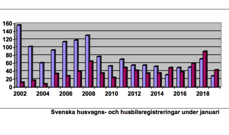 Under januari nyregistrerades 90 färre fritidsfordon, 43 husvagnar och 47 husbilar, än under samma månad i fjol. Förra året, som var det bästa året för fritidsfordon sedan HRF började föra sin statistik, nyregistrerades 3 349 husvagnar samt 7 218 husbilar vilket gav rekordsiffran 10 567 enheter och det kan noteras att det var första gången som 10 000 nyregistreringar under ett år passerades. En möjlig förklaring till minskningen för husbilar nu i januari kan vara att det funnits några som inregistrerats i samband med skatteändringen halvårsskiftet 2018 och dessa syns då inte i statistiken. Dock uppvisade även december 2018 en minskning, totalt blev det då 73 stycken medan det i december 2017 registrerades 137. Husvagnarna uppvisar den sämsta januarisiffran sedan HRF började föra sin statistik 2002 och dessa påverkas inte av skatten. Även på personbilsmarknaden syns kraftiga nedgångar.