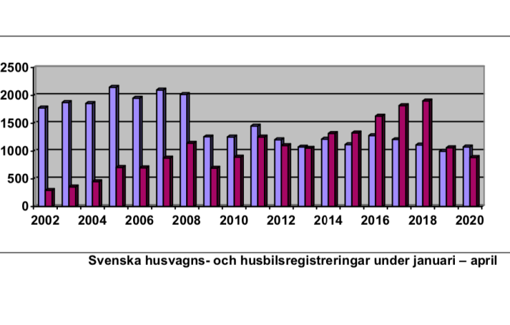 April månads husbilsregistreringar visar 498 stycken, medan det i april föregående år registrerades 612 husbilar. Hittills under kalenderåret 2020 har det totalt registrerats 883 husbilar, medan det under motsvarande period 2019 registrerades 1 062 stycken. Detta innebär en minskning med 16,85 procent för år 2020.