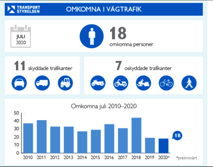 Under de senaste 12 månaderna (augusti 2019 - juli 2020) har 208 personer omkommit i vägtrafiken. Under de senaste föregående 12 månaderna (augusti 2018 - juli 2019) omkom 276 personer. Jämför man med ett 5-års medelvärde för motsvarande tidigare 12-månadersperioder har antalet omkomna ökat med 23 procent.