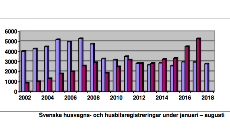 Under augusti månad 2018 registrerades 297 husvagnar. (Motsvarande månad året dessförinnan registrerades 268 stycken.) Hittills under 2018 betyder det 2 780 registrerade husvagnar mot 2 969 under samma period 2017. I procent innebär detta en minskning med 6,36 procent.