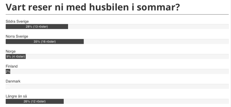 Sverige är lite av undersökningarnas land och så även vi på Husbil & Husvagn. På vår hemsida har vi alltid en undersökning en bit ned på förstasidan men vi vill även slå ett slag för våra äldre undersökningar. Här hittar du frågor och svar sedan åratal tillbaka, en del frågor har färre hittat till, medan andra har fler. Fördelen med få svaranden är ju att din röst blir desto viktigare...