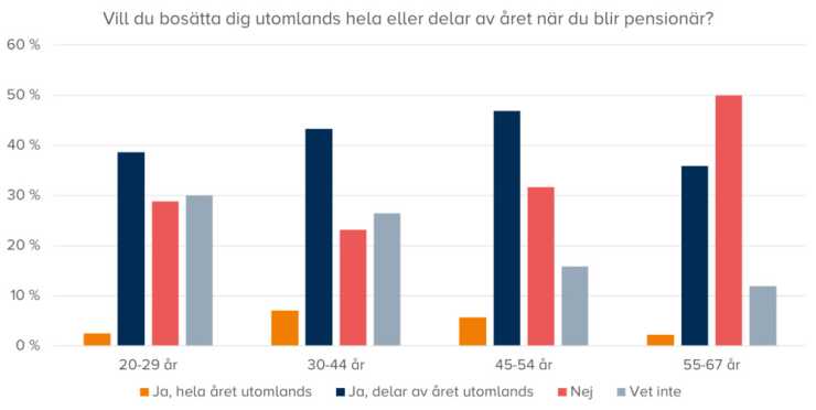Undersökningen är gjord i åldersgruppen 20-67 år som fått svara på frågan ”Vill du bosätta dig utomlands hela eller delar av året när du blir pensionär?” Den grupp som mest drömmer om att bo utomlands är åldersgruppen 45–54 år där över hälften (53 procent) helt eller delvis vill bosätta sig utomlands, men även i den yngsta åldersgruppen, 20-29 år har redan nu fyra av tio (41 procent) tankar på att flytta utomlands som pensionärer. De flesta vill bo utomlands delar av året, en av 20 vill lämna Sverige helt och bo utomlands hela året.