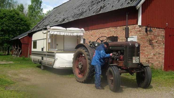 Dragfordonet kan inte sägas erbjuda någon högre komfort. Sitsen är av stål och något skydd mot vädrets makter finns inte. Åke sitter utomhus, regnar det så blir han blöt men kan förstås krypa in i värmen i husvagnen.