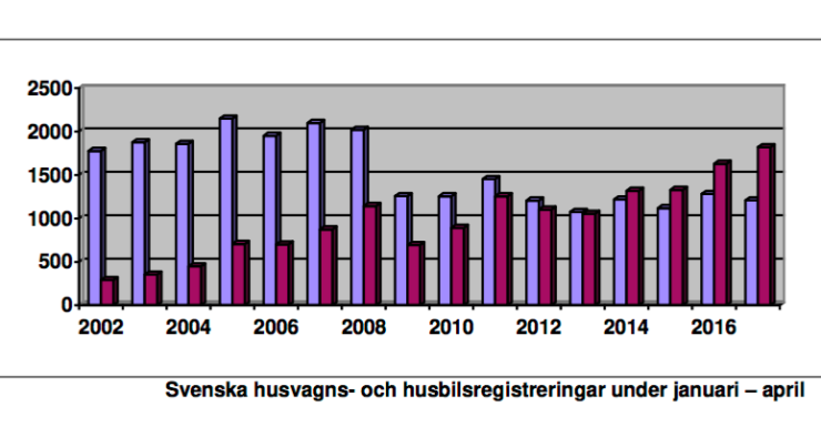 Under april månad 2017 registrerades 707 husvagnar. (Motsvarande månad året dessförinnan registrerades 749 stycken.) Hittills under 2017 betyder det 1 208 registrerade husvagnar mot 1 281 under samma period 2016. I procent innebär detta en minskning med 5,69 procent.