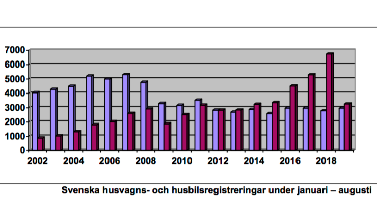 Augusti månads husbilsregistreringar visar 499 stycken, medan det i augusti föregående år registrerades 158 husbilar. Hittills under kalenderåret 2019 har det totalt registrerats 3 257 husbilar, medan det under motsvarande period 2018 registrerades 6 732 stycken. I procent innebär detta en minskning med 51,62 procent för år 2019.