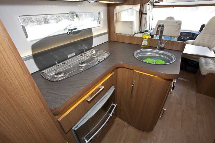 Köket håller normal husbilslayout som startar med en 145 liter stor kyl med 30 liters frysfack och fortsätter med ett L-format pentry. Trelågig häll med separat ugn. Här visar Kabe på gott säkerhetstänk i form av kraschsensor och läckindikator – allt för att förhindra olyckstillbud.
