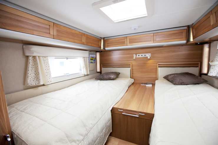 Långbäddar är ju svenskens favorit och det har Kabe tagit fasta på. Skulle andan falla på så kan man, i den här husbilen, genom att dra ut en skiva mellan bäddarna, lägga dit en extra dyna och skapa en familjesäng för familjen, varande eller blivande.
