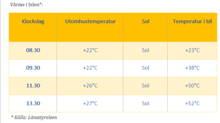 - Ha en termometer väl synlig i bilen så att oroliga förbipasserande kan se hur varmt det är i bilen.