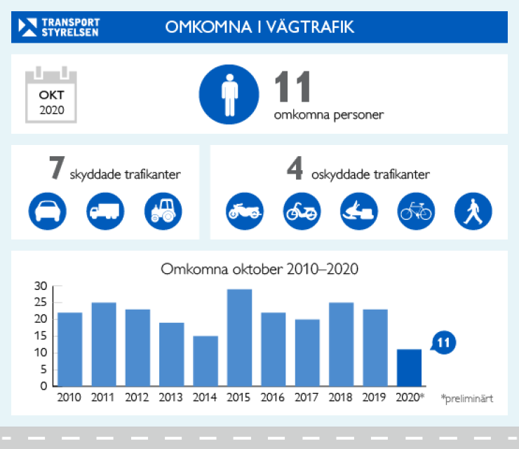 Under de senaste tolv månaderna (november 2019–oktober 2020) har 185 personer omkommit i vägtrafiken. Under de senaste föregående tolv månaderna (november 2018–oktober 2019) omkom 265 personer. Jämför man med ett fem-års medelvärde för motsvarande tidigare tolv-månadersperioder har antalet omkomna minskat med 31 procent.