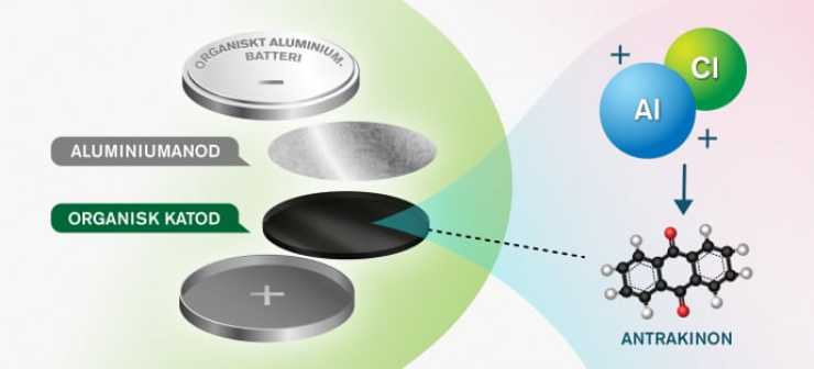 I det nya koncept som Patrik Johansson och Chalmers presenterar tillsammans med Robert Dominkos forskargrupp i Ljubljana har grafiten ersatts med ett nanostrukturerat organiskt katodmaterial. Det är uppbyggt av den kolbaserade molekylen antrakinon och har framställts och vidareutvecklats av Jan Bitenc, som gästforskat på Chalmers. Den organiska molekylen i katodmaterialet tar effektivt emot positiva laddningsbärare från elektrolyten, den lösning i vilken joner kan flyttas mellan polerna.