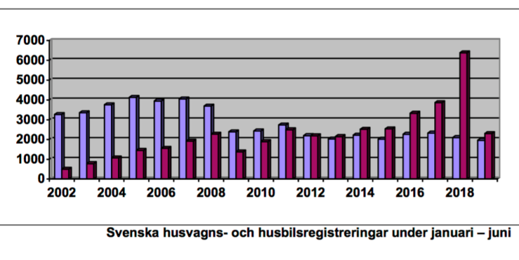 Under juni månad 2019 registrerades 458 husvagnar. (Motsvarande månad året dessförinnan registrerades 472 stycken.) Hittills under 2019 betyder det 1 962 registrerade husvagnar mot 2 095 under samma period 2018. Detta innebär en minskning med 2,96 procent.