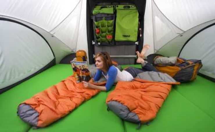 Invändigt ser den både stor och trivsam ut. Självuppblåsande madrasser ger ett mjukt underlag. Tältet fälls in i en låda vid körning till skydd från smuts.