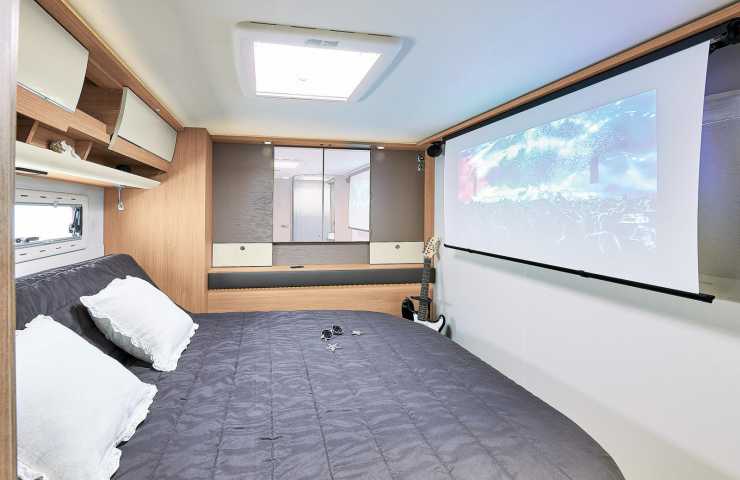 Helintegrerade Itineo RC 740 har en tvärställd dubbelsäng och plats för bioduk i sovrummet. Sovrum och badrum kan dessutom stängas av mot resten av bilen.