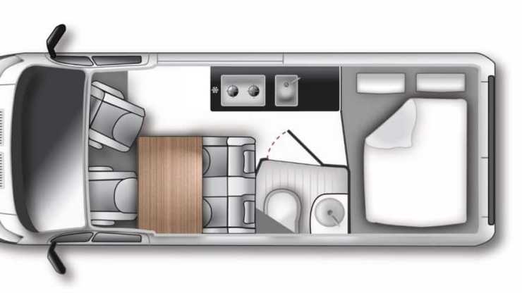 Det som främst skiljer denna Westfalia-byggda utställningsbil från den sedan tidigare befintliga 5,4 meter långa Nugget Plus är att det extra utrymmet använts till att göra badrummet större och till en generös tvärsäng i bak vilken de menar är en av de största i sin klass med måtten 200 x 130 centimeter. Alldeles innanför skjutdörren på sidan återfinns köket med en tvålågig spis, ho och kylskåp. På motsatta sidan av köket finns badrummet och framtill ett sittgrupp för fyra samt ett löstagbart bord. Ståhöjden anges till generösa 205 centimeter. Möjligen kan någon komma att känna igen sig från när Westfalia byggt inredning till Fords tidigare tredje generation av Transit.