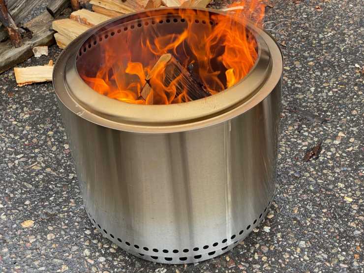 Att den inte avger rök som alla vanliga brasor beror på att konstruktionen tillför luft i överkant på elden vilket skapar en andra förbränning som eliminerar röken och ger mer intensiv värme. Detta under förutsättning att man inte lägger ved högre än överkanten vid flambegränsaren. När vi såg den i funktion kan vi konstatera att den är mycket effektiv.