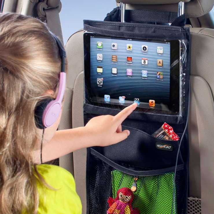 Företaget Smarta saker har tagit fram en hållare för iPad som fästs runt framsätets nackstöd. Hållaren har även fack för småsaker så att barnen kan ha ordning på annat som ger sysselsättning under resan.