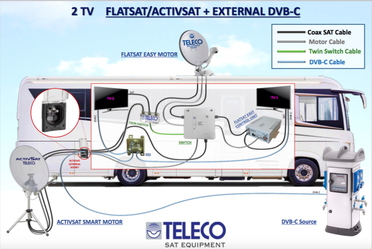 Teleco som har fyrtio års erfarenhet av satellit-teknik för antenner till fritidsfordon utvecklade därför den här automatiska tekniken som möjliggör att ettdera ha en separat och flyttbar parabol utöver den på taket alternativt koppla in sig på campingens nät.
