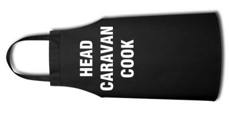 Vad sägs om ett förkläde med för camparen lämplig text som julklapp? Här i svart och på tvären men likväl skyddar det mot stänk och kladd.