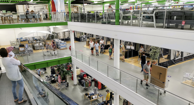 Obelink säljer campingtillbehör på tre plan och det finns rulltrappor för både människor och kundvagnar. Hissar också.