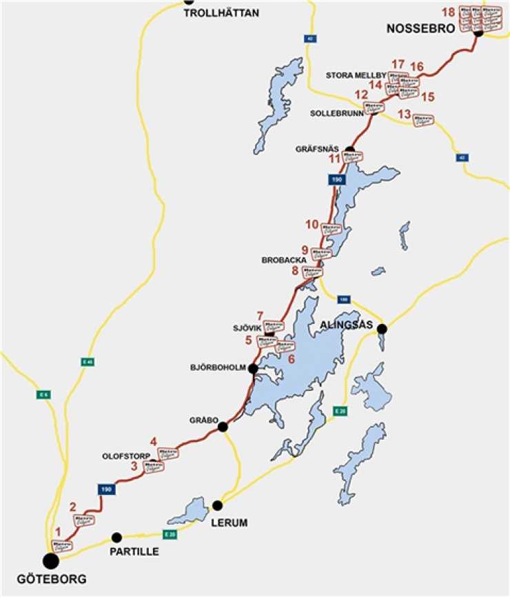 Retrovägen följer väg 190 mellan Göteborg och Nossebro, i Västergötland.