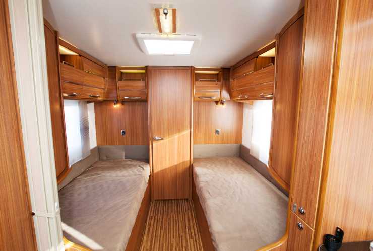 Utrymmet mellan kylen och spisen där kocken står och arbetar är 109 cm brett vilket gör det enkelt att passera. Överlag känns vagnen luftig och trivsam invändigt, också tack vare ljusinsläppet från takfönstren. Kylskåpet från Dometic är på 190 liter och har ett urtagbart frysfack. Ovanför kylen sitter mikrovågsugnen från Gorenje som ingår i pluspaketet. Till höger om kylskåpet finns en garderob med hängare och här inne hittar vi även expansionskärlet samt automatsäkringar. En täckskiva mot ledningar och kablar hade varit önskvärt i detta utrymme. Mellan kök och sovrum finns dels en jalusidörr som avgränsning och dels ett tv-skåp med en utfällbar tv-arm. När det gäller tv-armen har vi två anmärkningar. Dels placeringen som gör att det inte går att stänga jalusiet när tv:n är riktad mot sovrummet. Men även att tv-uttag och strömuttag i den testade vagnen sitter i garderoben intill själva tv-skåpet vilket gör att kablarna måste dras ur när skåpen ska stängas. Sovrummet är uppdelat i två längsgående sängar med måtten 202x80 cm samt 195x80 cm. Två kallskummadrasser och höjbara huvudändar ger bättre komfort tillsammans med den mjukt stoppade distansskivan som omger sängarna. Kallskum är för övrigt en högelastisk polyeter med bättre elasticitet än vanlig traditionell polyeterskumplast. Golvutrymmet mellan sängarna är 62 cm brett och golvmattor finns som tillval. Elektrisk golvvärme från Ebecco är däremot standard och vill du ha vattenburen golvvärme finns som sagt Supremevarianten. Elvärme i golvet är bra för den som står vid elstolpe medan vattenburen golvvärme (Supremeversionen) är bra vid fricamping men kan också ge en jämnare uppvärmning överlag. Längst bak i vagnen tronar det rymliga badrummet i vagnens fulla bredd. Bakom toaletten från Thetford finns ett fönster och i taket en ventil. I badrummet finns massor av fack till förvaring av tandborstar och hygienartiklar vilket underlättar badrumstillvaron. Slangarna under tvättstället hade möjligen kunnat döljas snyggare med en distansskiva men annars gillas möjligheterna till förvaring. Den rymliga duschkabinen har inga hyllor för schampon men väl en kant nära golvet där flaskor kan stå när man parkerat på sin campingplats. Sammanfattningsvis är Alpina 613 UT en bra utrustad vagn för par som prioriterar ett stort och rymligt badrum med en fullstor dusch. Oavsett vilken årstid man föredrar att campa. Som vanligt finns utmärkta möjligheter för gäster att sova i den bäddade sittgruppen.