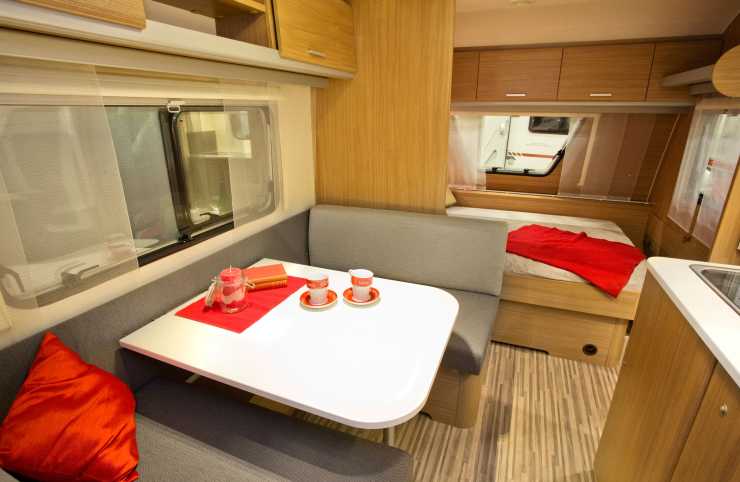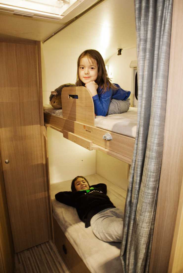 En enkel men smart lösning hittar vi direkt innanför dörren i form av den främre dubbelbädden som är tvärställd och har förvaring under sängbotten. Den har en 25 centimeter bred passbit i ena änden som i nedfällt läge tillåter passage för den som sover vid vagnens front. Fälls biten upp kan en bit madrass placeras i glipan och ger  då en 215 cm lång säng.
