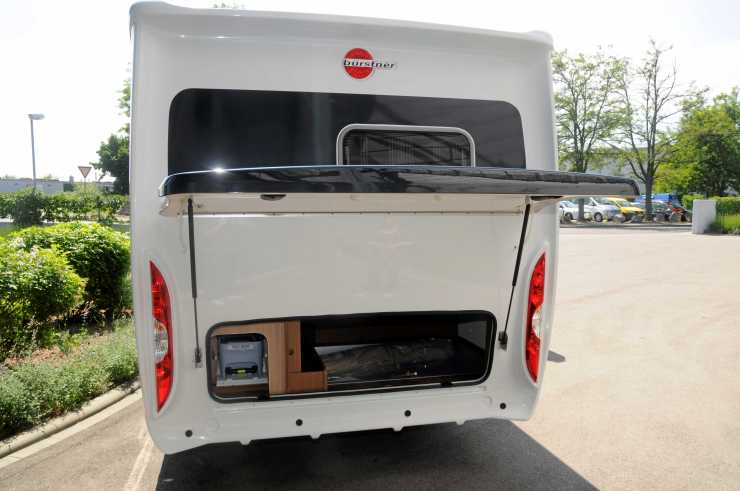 På vänster sida finns vattenpåfyllning och ingång för elkabeln. Bagageluckan hittas på bakväggen vilken även döljer toakassetten. En nackdel med denna lösning är svårigheten att fästa cykelställ. Enklaste lösningen är att bilen utrustas med dragkrok och cykelhållare anpassad för draget. Dragvikten på den bakhjulsdrivna husbilen är annars 2 000 kg.