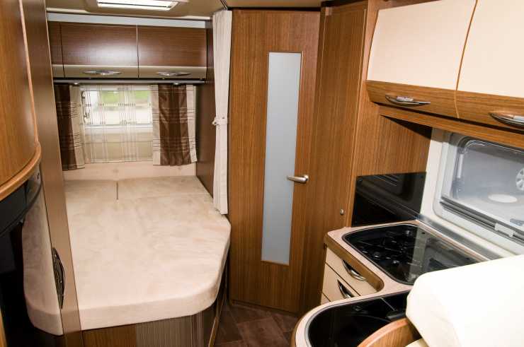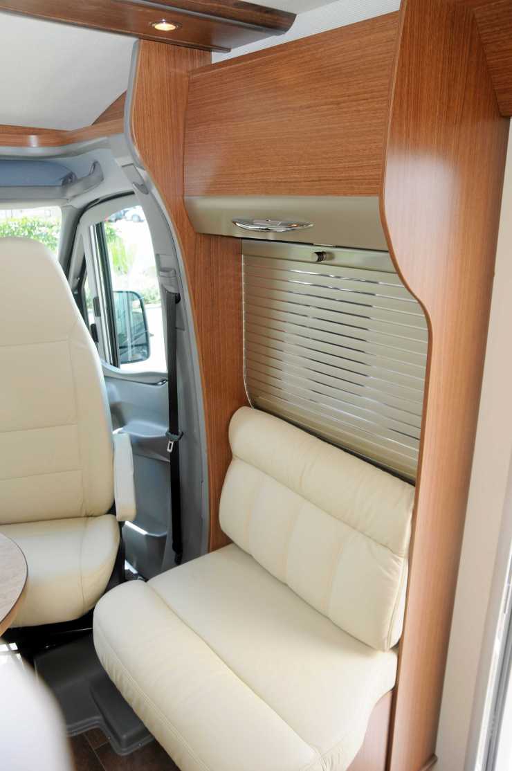 entrédörren går långt ner vilket underlättar insteget och på insidan möts man av en inredning som andas exklusivitet. Modellen jag provkört har snygg, ljus läderklädsel i sittgrupp och framstolar, som dessutom är standard i Sverige. Direkt till höger finns en fåtölj och under denna en utdragbar låda med två hinkar. Soffor och fåtöljer är bekväma att sitta i tack vare extra stoppning i knäveck och rygg. Bakom fåtöljen vid ingången finns en jalusivägg som döljer utrymmet för tv. Det rundade och snygga matbordet har en utfällbar extraskiva.