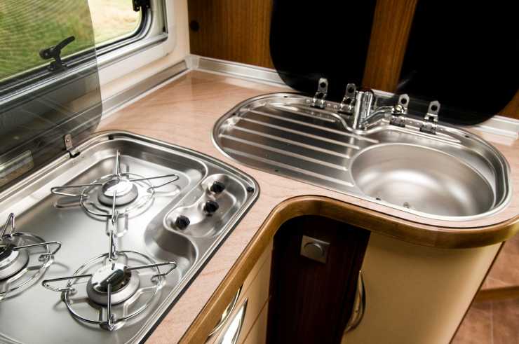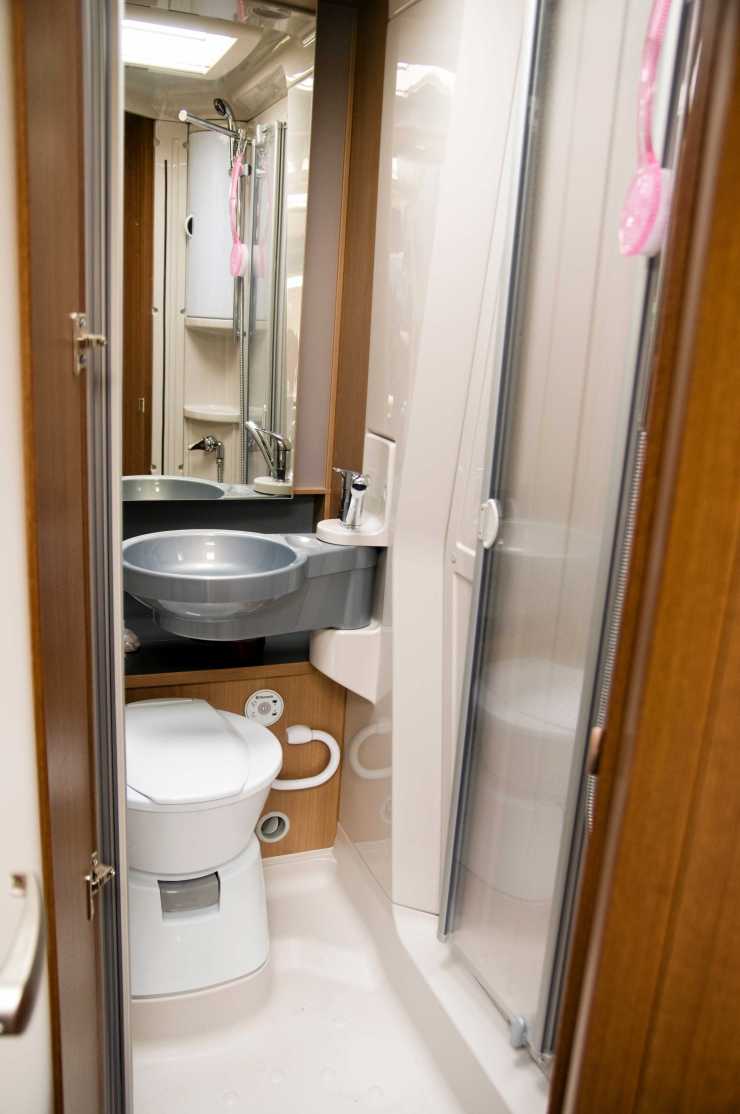 Längre bak kommer toadörren med ett fönster av frostat glas. Bürstners badrum är ett under av effektivt utnyttjande på liten yta. Det lilla tvättstället i plast går att vika undan. Duschkabinen är visserligen skramlig och bökig att stänga men väldigt smart utformad för att skydda väggarna från vattenstänk. Ett hörnskåp underlättar förvaringen liksom hyllor gjutna i väggplasten. Toalettstolen är en vridbar Thetford och på väggen bakom finns toalettpappershållare samt knapp för spolning.