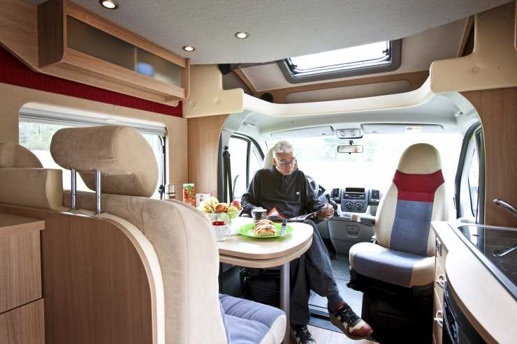 Sittgruppen består av förarhyttens stolar som vrids runt med ett enkelt handgrepp. I "baksätessoffan" ryms två bältade personer. Det är visserligen trångt för två vuxna men annars är det ovanligt bekväm stoppning. Matbordet är 104 x 65 cm stort men en extra utfällbar bordsskiva på 40 x 65 cm underlättar samvaron till bords. En nackdel för den som sitter på passagerarstolen är att man får dingla med benen eftersom golvet är lägre där än vid övriga platser runt bordet.
