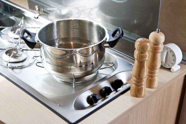 Ett problem som direkt upptäcks med denna korta Ixeo är att köket hamnar under den fällbara sängen. På grund av detta är överskåpen för små för att rymma tallrikar, och köket går överhuvudtaget inte att använda när sängen är nedfälld – vilket inte är fallet på varianterna med vinkelkök. Köksbänken mäter 113 x 50 cm och den är ingen dröm för seriösa kockar. Tre lådor finns under diskhon där bestick, tallrikar, kastruller och en stor del skafferivaror måste samsas.