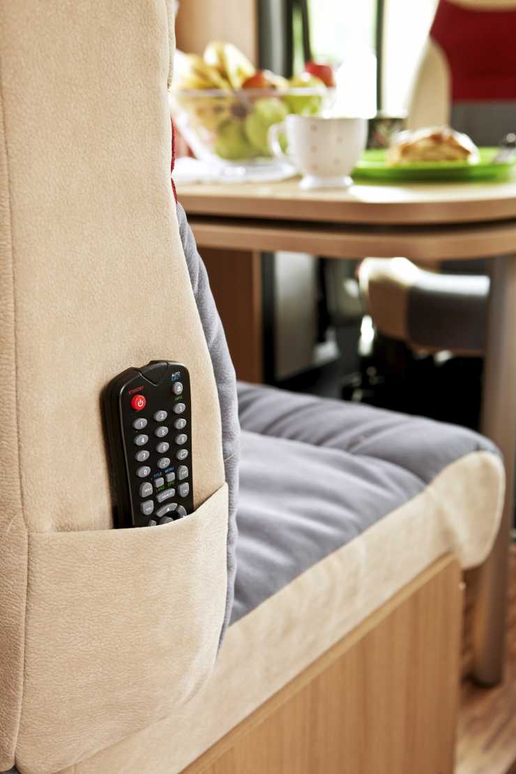 Till vänster när man kliver in genom ytterdörren finns en tv-vägg med stativ som kan vändas mot dubbelsängen. Däremot sitter tv:n för långt ner för att ses från taksängen. Ovanför tv-stativet sitter informationspanelen som är lättförståelig med sedvanliga nivåmätare och reglage för huvudström och vattenpump. Trumapannans manövrering sitter vid golvet på dubbelsängen, vilket är synd för den som har svårt att gå ner på knä eller den som ser dåligt.