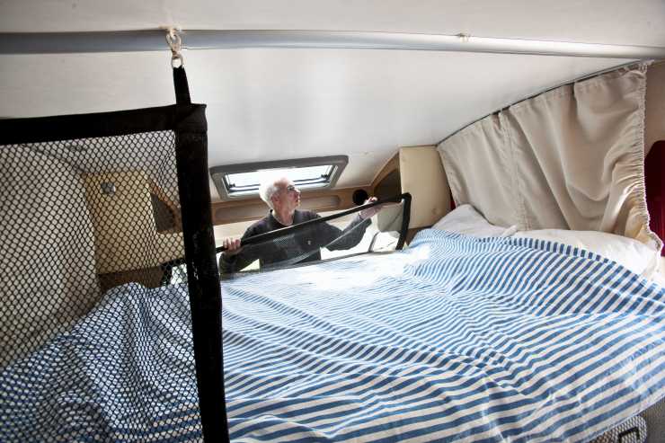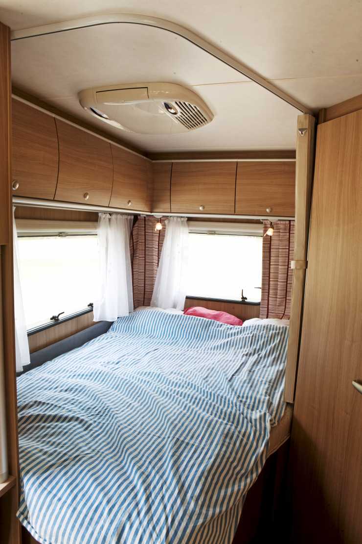 För att lättare komma upp i taksängen finns ett par trappsteg och väl på plats är det en väldigt bekväm och mysig "koja". Två sänglampor infällda i taket fungerar som läsbelysning och den 13 cm tjocka kallskummadrassen är bekväm. I taksängen ryms två vuxna, och faktiskt är den bredare och aningen bekvämare för två än den vanliga dubbelsängen. Måttbandet visar 145 x 195 cm och sitthöjden mellan madrass och tak är 75 cm. Sängen är dock svår att kliva i – och framförallt ur eftersom trappstegen är så höga att man mer eller mindre dråsar ner sista biten. Kuddarna måste förvaras på annan plats när bädden är i uppfällt läge.