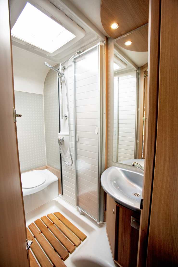 Toalettdelen är imponerande för att vara i en så pass liten husbil. Här finns handfat av plast och på golvet en snygg trätrall.
